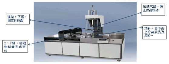 1.采取機(jī)械頂針排廢方式。模架下壓固定住材料,然后通過油缸將頂針頂出,沖出成品,功率較大,對(duì)材料較厚的產(chǎn)品有很好的清廢效果。